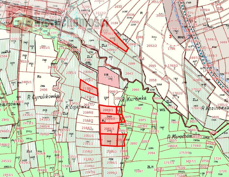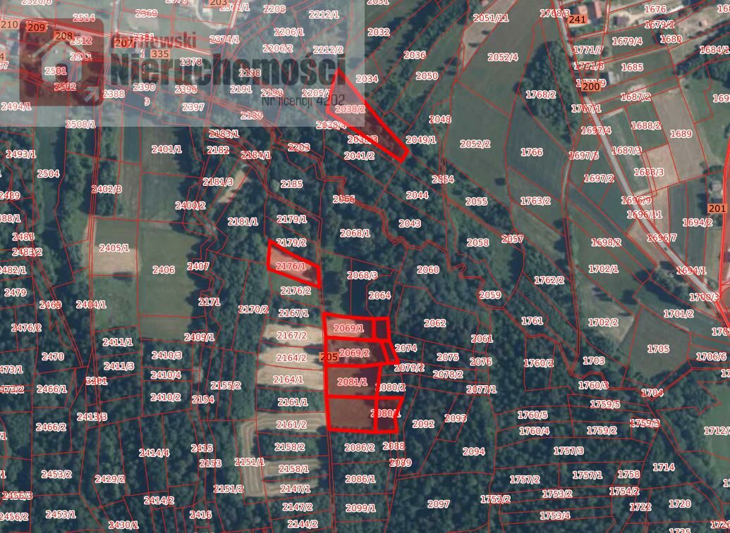 Działki nie stanowią jednego kompleksu, są rozrzucone na długości ok. 300m. Centralna część z domem ma ok. 86 arów.